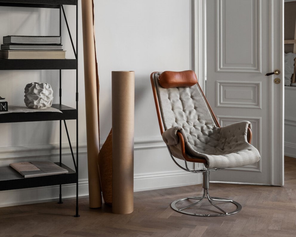 Iconic easy chair designed by Bruno Mathsson. The Jetson chair reflects both his obsession with comfort and a classic Swedish modern design approach. It features a bowl-shaped seat, ergonomically designed high back with head pillow. Chrome swivel base with a unique self-return mechanism.