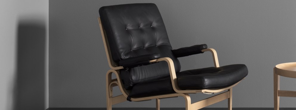 Classic easy chair designed by Bruno Mathsson. Ingrid is a sister to Karin, but in moulded beech wood. Ingrid has buttons on both the seat and the back cushion.