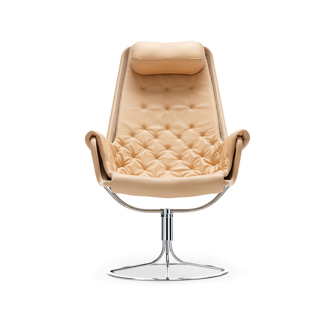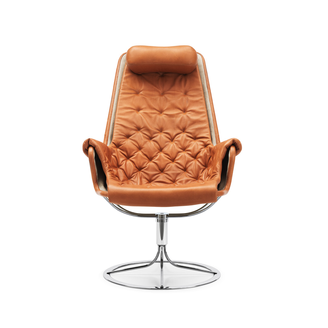 Iconic easy chair designed by Bruno Mathsson. The Jetson chair reflects both his obsession with comfort and a classic Swedish modern design approach. It features a bowl-shaped seat, ergonomically designed high back with head pillow. Chrome swivel base with a unique self-return mechanism.