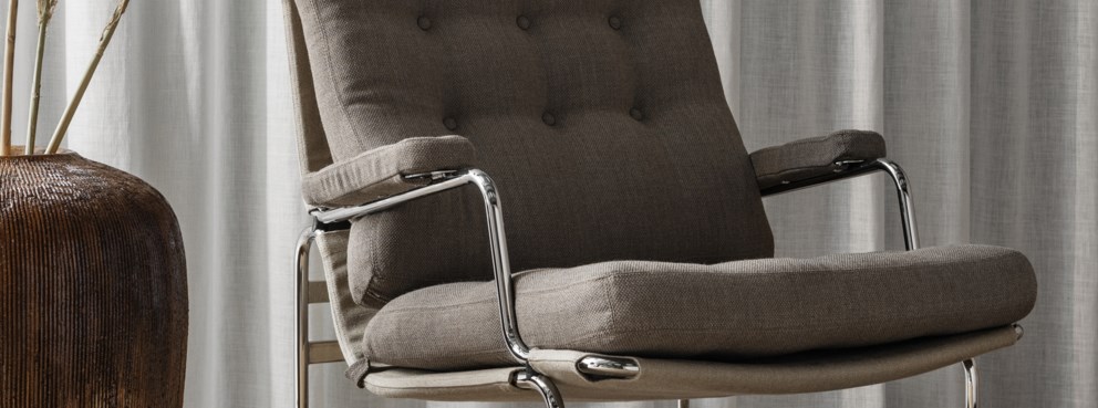 This classic elegant armchair was designed by Bruno Mathsson in 1969 and was the first item of furniture in a successful collaboration that lasted for several decades. Comfortable stuffed cushions rest on a chrome-plated frame with supporting web. The Karin range also features a stool and table.